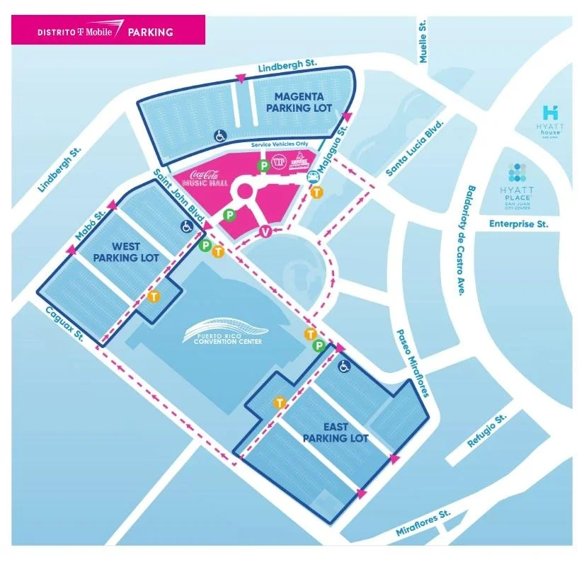 El estacionamiento estará disponible en el Magenta Lot y la única entrada permitida será por la calle Lindbergh. VER MAPA ABAJO.